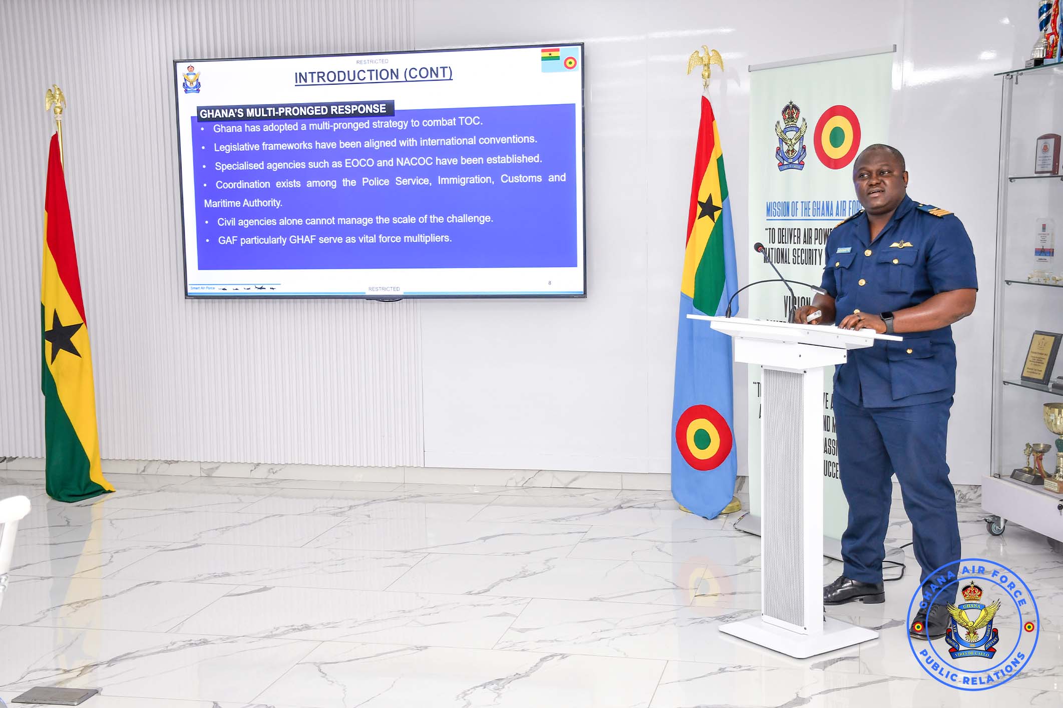As part of the engagement, the Deputy Director of Air Operations, Wing Commander Davis Aboagye delivered a presentation on “The Role of the Ghana Air Force in Combating Transnational Organised Crime in Regional Security and Development.” The presentation emphasised the impact of transnational organised crime on national security, national strategies and legal instruments, as well as regional and international co-operation mechanisms.